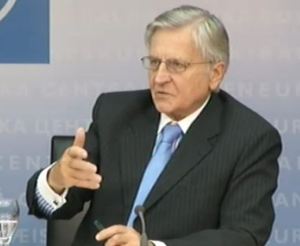 EKP:n tiedotustilaisuudessa Trichet suorastaan kiihtyi, kun saksalaistoimittaja asetti keskuspankin toiminnan kyseenalaiseksi. Toimittaja viittasi saksalaisten ekonomistien esittämiin arvioihin, joiden mukaan EKP on muuttunut vakauden vaalijasta epävakauden ylläpitäjäksi sekä euron puolustuslinnakkeesta roskapankiksi ja euron pehmentäjäksi.