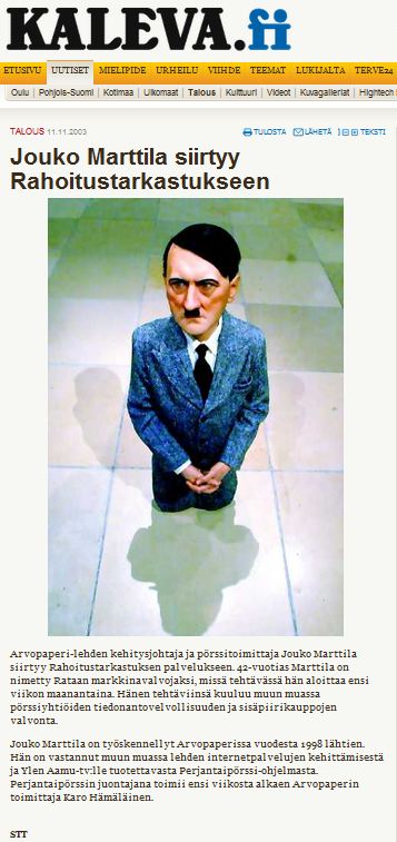 Pari klikkausta paljasti, että kyseessä oli Kalevan verkkolehden uutinen, jossa kerrottiin nimityksestäni Rahoitustarkastuksen markkinavalvojaksi. Uutinen oli päivätty 11.11.2003 ja kuvituksena käytettiin kivilattialle polvistunutta Hitler-hahmoa. Yllättävä kuvalöytö hämmästytti meitä molempia. Miten Hitler liittyi nimitysuutiseeni?
