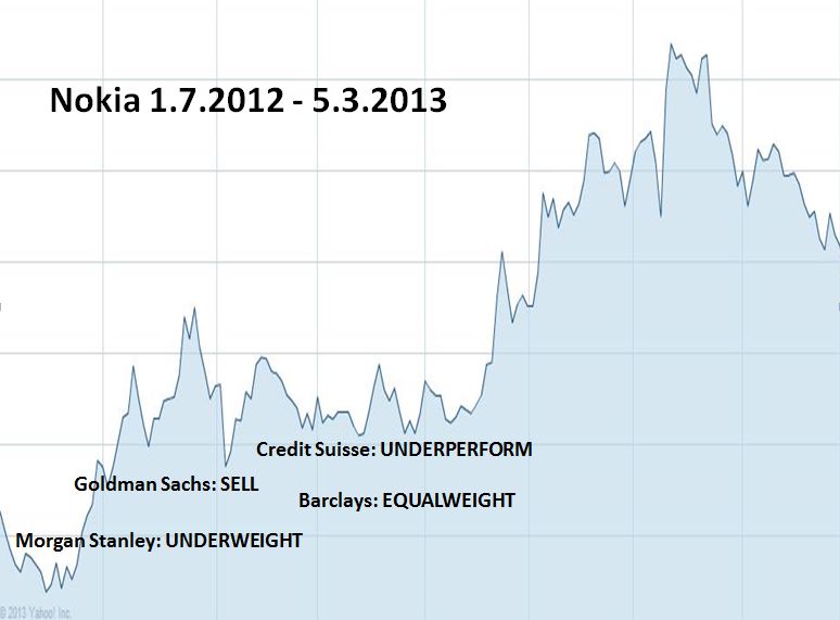 Nokian ja Applen kurssit kulkivat viime syksynä jyrkästi eri suuntiin. Nokia nousi ja Apple laski. Samaan aikaan suuret pankit ja pankkiiriliikkeet suosittelivat myymään Nokiaa ja ostamaan Applea. Jos noudatti analyytikkojen suositusta, hävisi varmasti rahansa. Jos toimi päinvastoin kuin suositeltiin, pääsi tukevasti voitolle. Näin analyysitalojen omat rahastotkin tekivät.