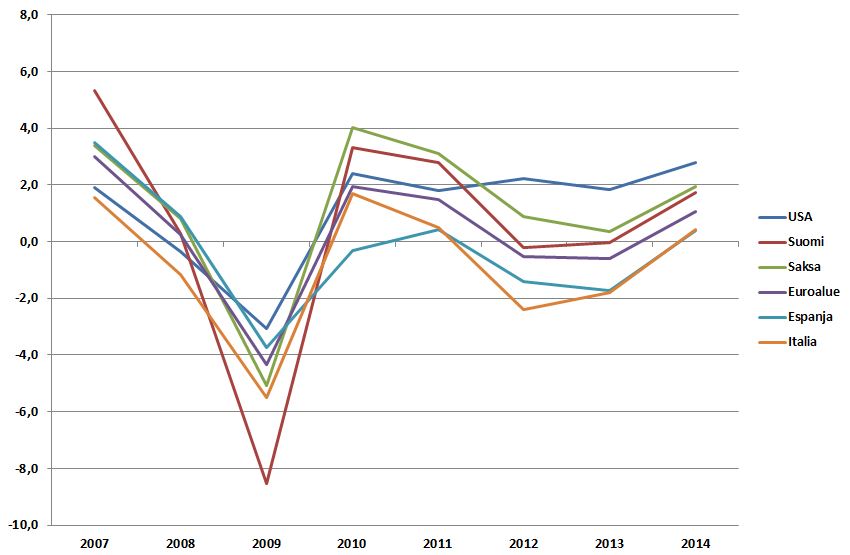 Euroopassa talouden epävarmuutta lisää Italian hallituskriisi. Maan talous on ollut tuuliajolla jo vuosia. Kasvu on heikkoa, mutta työvoimakustannukset jatkavat kasvuaan. Toisin on Espanjassa, jonka teollisuus on saanut painettua kustannuksia alas ja viennin taas vetämään. Suurin uhka Euroopan vakaudelle tulee taas vaihteeksi Italiasta, missä työvoimakustannukset ovat olleet hitaasta kasvusta huolimatta nousussa. Tilanne on samankaltainen Suomessa, missä yksikkötyökustannusten kasvuvauhti (kuva alla) on edelleen EU-maiden kärkipäässä.
