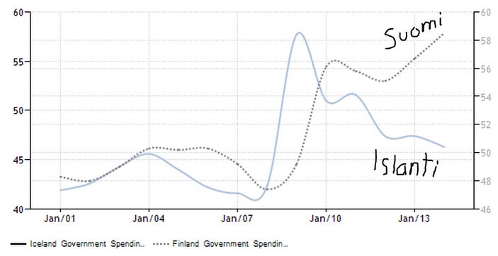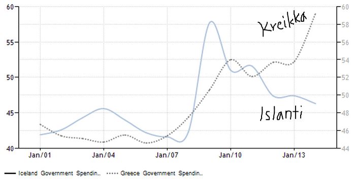 Islannissa julkisten menojen nousu pysähtyi finanssikriisiin. Pankkien sijasta valtio pelasti kotitaloudet velkakierteeltä. Kreikassa velan päälle on kasattu uutta velkaa ja suhteellinen velkaantuminen sekä valtion menojen kasvu ovat talousromahduksen jatkuessa vain kiihtyneet.