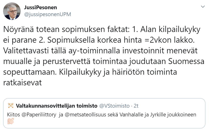 Tällä kertaa koko metsäteollisuus piti pysäyttää, jotta 24 väärää tuntia saatiin vaihdettua 24 oikeaan tuntiin, jotka olivat aiemmin maistuneet väärälle. Kokonaisuudessaan metsäteollisuuden kaksivuotinen sopimus noudattaa yleiseksi muodostunutta 3,3 prosentin linjaa.