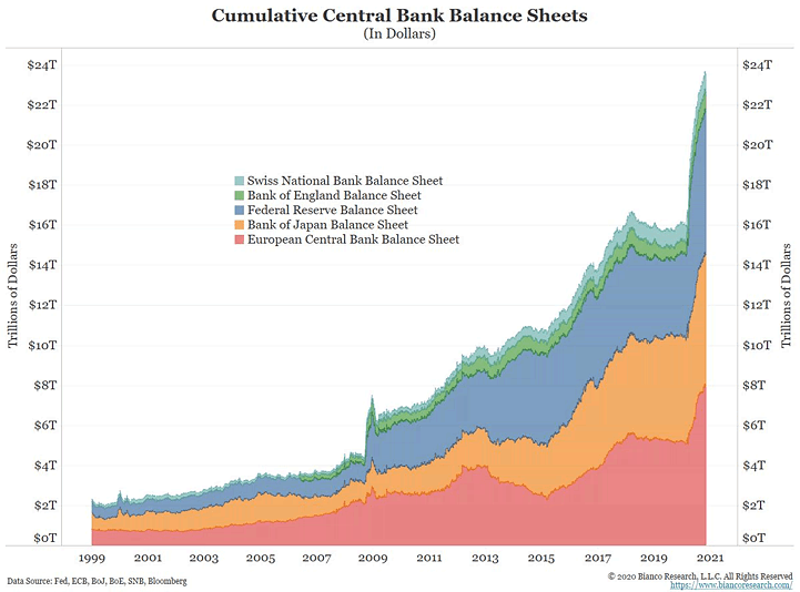 Markkinariskit ovat siirtyneet keskuspankkien taseisiin. Keskuspankit ovat painaneet uutta rahaa, jolla on ostettu valtionlainoja ja muita arvopapereita. Mittaamaton rahanmäärän kasvu on pitänyt korot alhaalla ja varallisuusarvot korkealla. Käynnissä on valtava tulonsiirto vähävaraisilta niille, joilla on sijoitusvarallisuutta.