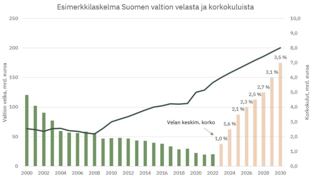 Nykyhallituksen holtiton velkaantuminen aiheuttaa moninkertaisen tuskan tulevaisuudessa, kun korkomenot kasvavat samaan aikaan heikkenevän huoltosuhteen kanssa. Valtionlainojen korkojen vakiintuminen normaalille tasolle tietäisi miljardien eurojen kasvua korkomenoissa. Se huolettaa enemmän kuin velan suhteellinen osuus kansantalouden kokonaistuotannosta, sillä korkomenot ovat poissa jostain muusta kuten vanhustenhoivasta, terveydenhuollosta tai koulutuksesta.