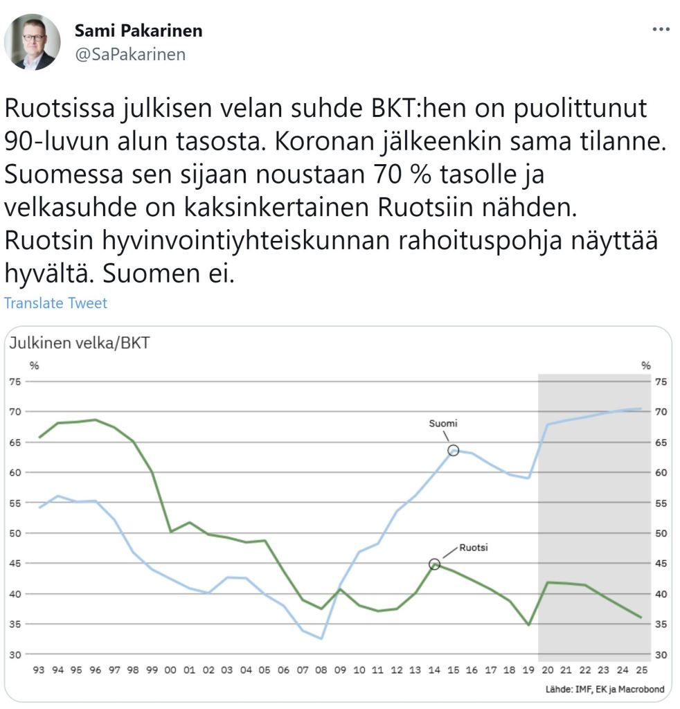 Hallitus selittää menojen kasvua koronalla, sodalla ja inflaatiolla. Se on vain puolet totuudesta, koska hallituspuolueet ovat lisänneet tuntuvasti kriiseistä riippumattomia menoja. Ruotsi on kärsinyt samoista kriiseistä, mutta siellä velkaantuminen ei ole lähtenyt käsistä. Pikemmin päinvastoin, vastuullinen talouspolitiikka on pitänyt velan hallinnassa, kuten EK:n Sami Pakarinen muistuttaa.