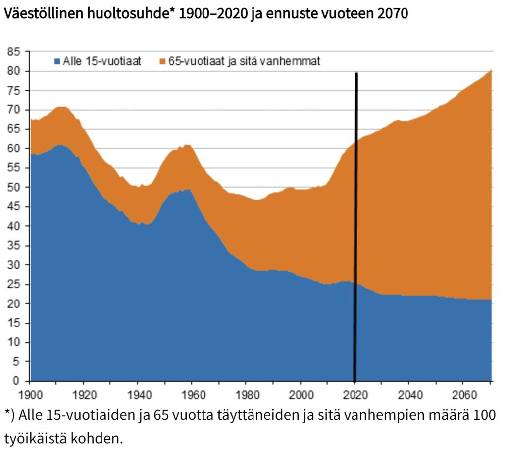 Veronmaksajien rahat eivät yksinkertaisesti riitä samankaltaisen hyvinvointiyhteiskunnan ylläpitämiseen kuin 1970-luvulla, jolloin väestö oli nuorta ja työvoimaa riittäväsi. Vuonna 1972 Suomessa oli noin 50 prosenttia enemmän 20–30-vuotiaita kuin vuonna 2020.