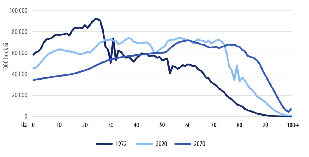 Vuonna 2070 nuorten aikuisten määrä supistuu edelleen kolmanneksella. Vastaavasti 60–70-vuotiaiden määrä kasvaa kolmanneksella ja sitä vanhempien määrä vielä paljon enemmän. Yli 65-vuotiaita on tulevaisuudessa kolme kertaa enemmän kuin alle 15-vuotiaita, kun nykyistä hyvinvointia rakennettaessa suhteet olivat päinvastoin. Eläkeläisten valtakunnassa työtä tekeviä veronmaksajia on entistä vähemmän. Nykyinen hyvinvointi on mitoitettu erilaiseen maahan kuin Suomi nyt ja tulevaisuudessa on.